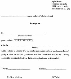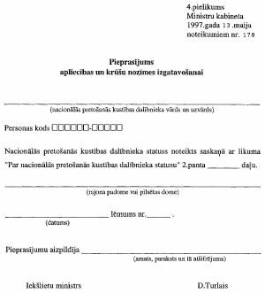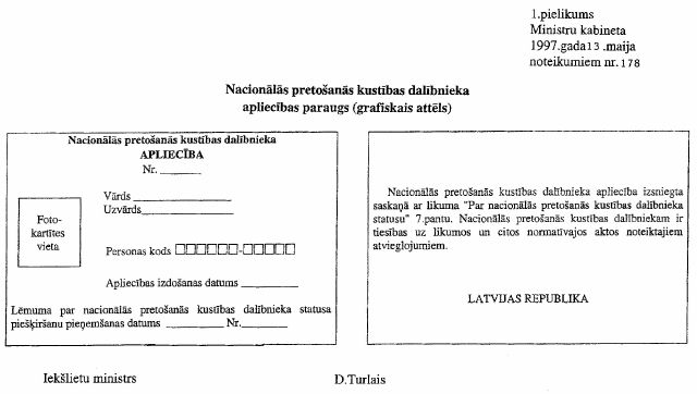3. Apliecību, kā arī krūšu nozīmi (2.pielikums) izsniedz saskaņā ar likumu "Par nacionālās pretošanās kustības dalībnieka statusu".