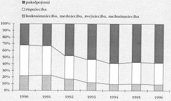 Rūpniecības6 īpatsvars IKP struktūrā ir samazinājies no 34,7% 1990.gadā līdz 22,2 % 1996.gadā.