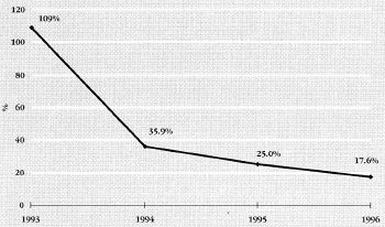 1996.gadā inflāciju visvairāk ietekmēja pakalpojumu un nepārtikas preču cenu pieaugums, attiecīgi par 23,5% un 21,9% gadā. Pārtikas produktu cenas savukārt pieauga tikai par 12,4 procentiem. Turklāt dažiem pārtikas produktiem bija vērojams samērā liels cenu kritums - dārzeņiem un kartupeļiem attiecīgi par 15 procentiem un 49 procentiem.