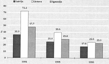 1996.gadā Latvijā bija zemākā gada inflācija Baltijas valstīs (Igaunijā - 23,1%, Lietuvā - 24,6%).