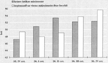 Kā liecina mājsaimniecību budžetu apsekojuma dati, 1996.gadā mājsaimniecību rīcībā esošie ienākumi uz vienu mājsaimniecības locekli bija 51,52 lati. Sākot ar 1996.gada III un IV ceturksni, mājsaimniecību ienākumi bija nedaudz augstāki par krīzes iztikas minimumu, taču gada vidējie rādītāji tomēr nesasniedza krīzes iztikas minimuma lielumu.