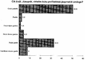 Acīmredzot, sakarā ar to, ka profilaktiski urologu (andrologu, seksopatalogu u.c.) apmeklē ļoti neliels vīriešu skaits, 51% vīriešu bija grūti atbildēt uz jautājumu - cik bieži vīrietim būtu profilaktiski jāapmeklē urologs (andrologs, seksopatalogs u.c.). Vislielākais skaits no tiem, kuriem bija grūti atbildēt ir vecumā no 31-34 gadiem.