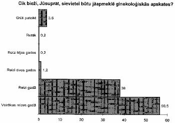 Vairāk kā 80% sieviešu izteikušās ka pie ginekologa uz profilaktiskajām apskatēm. No tām sievietēm, kuras iet uz profilaktiskajām ginekoloģiskajām apskatēm, vairākas reizes gadā vai reizi gadā to dara 85%. Lai gan 95% sieviešu uzskata, ka profilaktiski ginekologu vajadzētu apmeklēt vismaz reizi gadā (skat. 22. zīm.), tomēr arī lielāka daļa sieviešu, kuras neveic profilaktiskās ginekoloģiskās apskates uzskata, ka pie ginekologa jādodas tad, kad jau ir sūdzības ginekoloģiskajā jomā. Savukārt, 13% sieviešu atzīst, ka nevar samaksāt par vizīti .