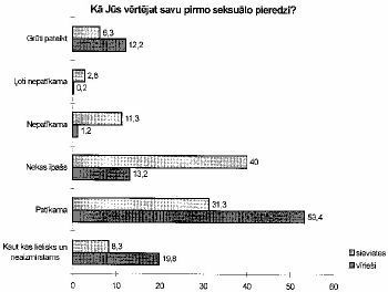 Novērtējot savu pirmo seksuālo pieredzi sieviešu un vīriešu viedokļi diezgan ievērojami atšķiras. Lielākā daļa vīriešu (63%) to novērtējuši kā pozitīvu emocionālu pārdzīvojumu (kaut kas lielisks un neaizmirstams vai patīkams), kamēr gandrīz puse sieviešu (40%) to novērtējušas kā nenozīmīgu notikumu (nekas īpašs), bet 14% sieviešu vērtējums ir pat negatīvs (nepatīkama, ļoti nepatīkama) (skat. 26. zīm.).