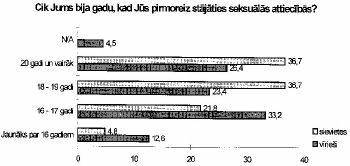 Pētījumā noskaidrojās, ka no visiem respondentiem, seksuālās attiecības nav bijušas 13% vīriešiem un 11% sievietēm (skat. 23., 24. zīm). Līdz 18 gadiem seksuālās attiecības ir jau bijušas 45% vīriešu. Kā liecina dati, lielākā daļa sieviešu seksuālajās attiecībās stājās pēc 18 gadiem (skat. 27. zīm.). Seksuālās attiecības ar pirmo dzimumpartneri vienai trešdaļai vīriešu ilga tikai vienu nakti, tikpat daudz vīriešu atzīst, ka seksuālas attiecības uzsākt viņus pamudināja interese (skat. 29. zīm.). Savukārt, divām trešdaļām sieviešu seksuālās attiecības ar pirmo dzimumpartneri ilga apmēram gadu un ilgāk.
