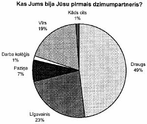 No visiem tiem, kuriem ir bijušas seksuālās attiecības, vīrs vai sieva kā pirmais dzimumpartneris ir bijuši, tikai 7% vīriešiem un 19% sieviešu. Savukārt apgalvojumam, ka "sievietei jābūt nevainīgai, stājoties laulībā", piekrīt 33% vīriešu un 22% sieviešu (skat. 113. zīm.).