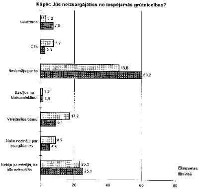 Tikai viena trešā daļa vīriešu un sieviešu pirmo seksuālo attiecību laikā izsargājās no iespējamās grūtniecības, visbiežāk lietojot tādus kontracepcijas veidus kā prezervatīvs vai pārtrauktais dzimumakts.