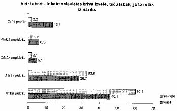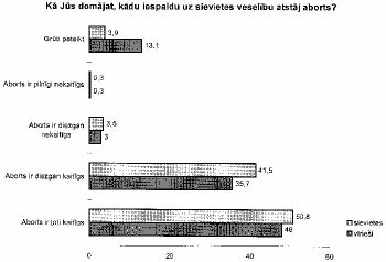 Uz vispārīgajiem jautājumiem par nevēlamu grūtniecību un abortu gan sievietes, gan vīrieši atbildējuši diezgan līdzīgi (skat. 57. - 60. zīm.), bet tādos jautājumos, kas attiecas uz sievietes rīcību aborta gadījumā vērojama viedokļu atšķirība starp vīriešiem un sievietēm. Vīriešu nostāja ir kategoriskāka pret abortiem, pret sievietes tiesībām izlemt izdarīt abortu (skat. 61. -64. zīm.).