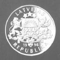Centrā Latvijas Republikas lielā ģerboņa attēls, zem tā gadskaitlis 1996, ģerbonim apkārt lokveidā uzraksts LATVIJAS REPUBLIKA.