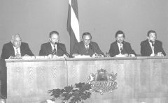 deputāts Valdis Nagobads, finansu ministrs Roberts Zīle; robežšķirtnē — Ministru prezidents Guntars Krasts / Ministru prezidents Andris Šķēle; deputāts Oskars Grīgs, aizsardzības ministrs Tālavs Jundzis; iekšlietu ministrs Ziedonis Čevers;