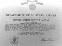 | Ar šo tiek apliecināts, ka Mičiganas ģenerāladjutants apbalvo prezidentu Gunti Ulmani, Latvijas bruņoto spēku virspavēlnieku, ar “Distinguished Service Medal” (medaļu par nopelniem) par sevišķi izcilu ieguldījumu Latvijas un Mičiganas sadarbībā programmas “Partnerattiecības mieram” ietvaros. Viņa skatījums, nenogurstošie pūliņi un uzticība brīvības principiem ir devuši nepārvērtējamu ieguldījumu Eiropas un brīvās pasaules pilsoņu drošībā. Viņa ārkārtējās vadītāja spējas ir iedvesmojušas Mičiganas nacionālajā gvardē un Latvijas bruņotajos spēkos dienējošos kareivjus un lidotājus. Dinamiskās proporcijas, kas raksturo prezidenta Ulmaņa darbību Latvijas, Savienoto Valstu un Mičiganas nacionālās gvardes labā, ir nodrošinājušas viņam redzamu vietu pasaules ievērojamāko valstsvīru vidū. | |