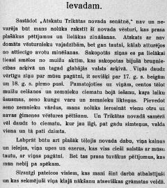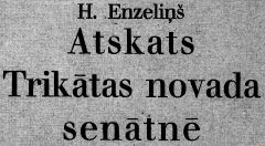 Liels paldies Jums par atsūtīto kalendaru un Jūsu grāmatu “Atskatu Trikātas novada senatnē”. Jūs nebūsiet pārsteigti, ja Jums pateikšu, ka manu sirdi nekas vairāk neiepriecina, kad redzu, ka mūsu senatnes pētīšana arvienu vairāk padziļinājas, dodot mums stiprinājumu mūsu lielajās cīņās un arī jaunu spēku grūtību pārvarēšanai nākotnes celšanā. Jums par Jūsu darbiem pienākas vislielākā pateicība, un jāvēlas tikai, lai Jūsu jaunajam darbam rastos plašs lasītāju skaits, ko tas pilnā mērā pelna.