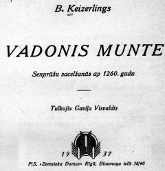 Valsts Prezidenta K.Ulmaņa kunga uzdevumā nosūtu Jums atsevišķās aploksnēs Keizerlinga romānu “Munte” un šī romāna tulkojumu, ko patlaban iespiež laikraksts “Rīts”. Tas ir drausmu pilns stāsts par senprūšiem, un šīs vecās lietas Jums rūp.