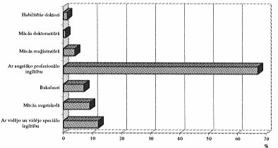 Varam pamatoti teikt, ka Valsts kontrolē strādā augsti izglītoti darbinieki: 2 darbinieki (1,3 %) ir habilitēti doktori, 1 darbinieks (0,7 %) mācās doktorantūrā, 6 darbinieki (4%) mācās maģistratūrā, 101 darbiniekam (67 %) ir augstākā profesionālā izglītība, 11 darbinieki (7 ) ir bakalauri, 13 darbinieki (9%) mācās bakalaura grāda iegūšanai, 19 darbiniekiem (12 %) ir vidējā un vidējā speciālā izglītība (sk. 6.diagrammu).