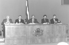Apspriežot un vērtējot: Saeimas prezidijs — Māris Rudzītis, Indulis Bērziņš, Alfreds Čepānis, Aigars Jirgens un Andris Ameriks; zālē — deputāti Pēteris Keišs, Andrejs Požarnovs, Jānis Lagzdiņš, Jānis Ābele, Dzintars Ābiķis, Jānis Straume, Māris Grīnblats.