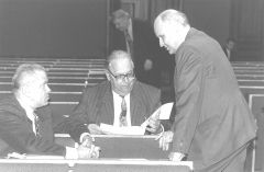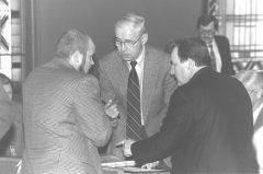 Diskutējot un pārrunājot: deputāti Roberts Dilba, Viesturs Gredzens, Jānis Rubulis;
