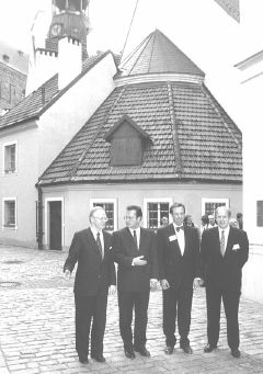 Latvijas ārlietu ministrs Valdis Birkavs, Vācijas ārlietu ministrs Klauss Kinkels, Igaunijas ārlietu ministrs Tomass Hendriks Ilvess un Lietuvas ārlietu ministrs Aļģirds Saudargs sarunu starpbrīdī, Rīgā, Konventa sētā 1997.gada 17. oktobrī