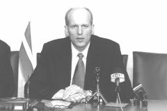 Ministru prezidents Guntars Krasts preses konferencē pēc atgriešanās Rīgas lidostā 1997.gada 21.oktobrī Foto: Māris Kaparkalējs, “LV”
