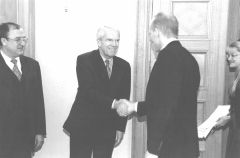 Pie Saeimas priekšsēdētāja biedra Vakar, 23.oktobrī, Saeimas priekšsēdētāja biedrs Andris Ameriks tikās ar Vācijas Federatīvās Republikas Bundestāga Juridiskās komisijas delegāciju, kuru vada komisijas priekšsēdētājs Horsts Eilmans ( Horst Eylmann ) (augšējā attēlā). VFR Bundestāga Juridiskās komisijas delegācija atzinīgi novērtēja Latvijas veikumu parlamentārajā likumdošanā. Runājot par konkrētu sadarbību juridiskajā jomā, viesi piedāvāja palīdzību juristu izglītošanā. Kā akcentēja delegācijas vadītājs H.Eilmans, šis jautājums Latvijai ir būtisks, gatavojoties integrācijai Eiropas Savienībā, jo nepieciešams ne tikai saskaņot likumdošanas aktus ar ES, bet arī sagatavot speciālistus, kas prastu šos likumus likt lietā. H.Eilmans apliecināja, ka Vācija ciena Latvijas centienus iestāties ES un ir visu triju Baltijas valstu interešu aizstāve. Saeimas priekšsēdētāja biedrs A.Ameriks augstu novērtēja Vācijas puses atbalstu Latvijas iestājai ES, kā arī izteica cerību par Latvijas un Vācijas divpusējo attiecību veiksmīgo gaitu, ko veicina abu valstu parlamentu sadarbības grupas. Latvijas un Vācijas parlamenta sadarbības grupa ir skaitliski lielākā Latvijas parlamentā. VFR Bundestāga Juridiskās komisijas delegācija ceturtdien tikās arī ar Saeimas Juridiskās komisijas deputātiem. Saeimas preses dienests |