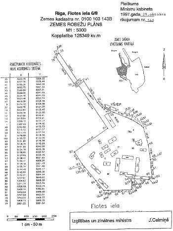 1. Saglabāt valsts īpašumā un nodot Izglītības un zinātnes ministrijas valdījumā nekustamo īpašumu — zemi 125349 m2 platībā (grupa 103, grunts 143B), ēkas un būves — Rīgā, Flotes ielā 6/8. Zemes gabala robežas norādītas pielikumā.
