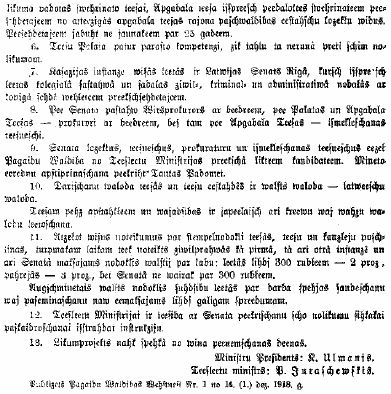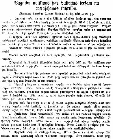 Tautas padomes apstiprinātais nolikums kļuva par Latvijas tieslietu resora un visu tiesu darbības pirmo stūrakmeni, par sava veida Tieslietu ministrijas (TM) satversmi un galveno likumu, no kura laika gaitā izauga citi likumi. 6.decembra dokuments saturēja daudz jaunu principu, salīdzinot ar bij. Krievijas attiecīgajiem likumiem: likvidēja otro miertiesu instanci — miertiesnešu sapulci, nodibinot tās vietā apgabaltiesu; atjaunoja pagasttiesas; likvidēja zemnieku virstiesu, nodibinot tās vietā miertiesu — miertiesneša un divu pagasttiesu priekšsēdētāju sastāvā utt.