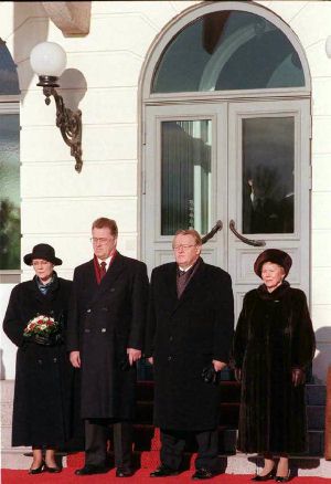 Latvijas Valsts prezidents Guntis Ulmanis ar Ainu Ulmanes kundzi (attēlā pa kreisi) — uz Somijas zemes, Somijas prezidenta Marti Ahtisāri un Evas Ahtisāri kundzes viesis vakar, 4.novembrī