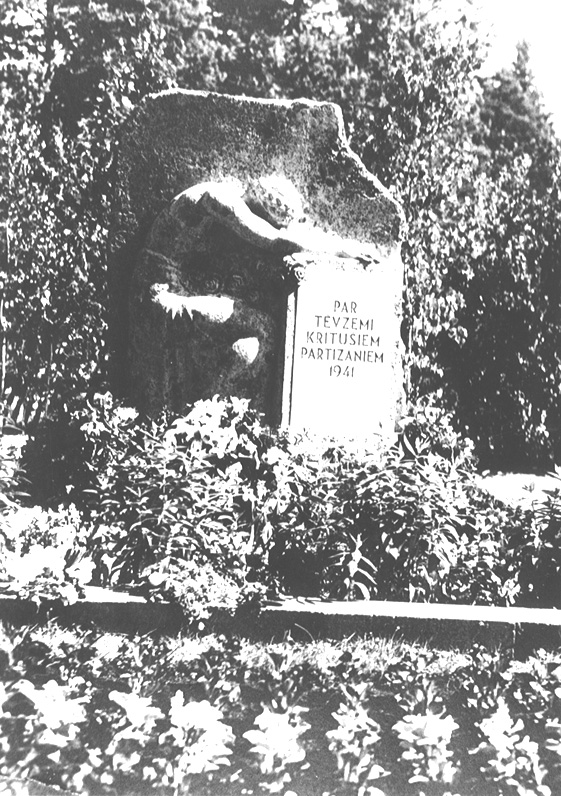 Piemineklis 1941. gada 4. jūlijā pie Raganas kritušo astoņu nacionālo partizānu piemiņai Inčukalna kapos, autors: tēlnieks Kārlis Zāle, materiāls: šūnakmens, forma: memoriāls ansamblis, centrā stēla ar cilnī kaltu sērojošas sievietes figūru, izmēri: 145 x 154 x 59 cm, atklāts: 1944. gada jūlijā, iznīcināts piecdesmitajos gados, 1988. gadā atjaunots, 1944. gada fotouzņēmums