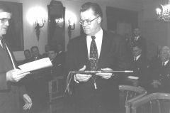 Svinīgajā reizē Rīgas pils Ģerboņu zālē Valsts prezidentam Guntim Ulmanim, aizsardzības ministram Tālavam Jundzim un NBS komandierim Jurim Dalbiņam (augšējā attēlā no labās) tiekoties ar Latvijas armijas virsniekiem. Apliecinot paveikto bruņoto spēku veidošanā un attīstībā, aizsardzības ministrs Tālavs Jundzis Valsts prezidentam Guntim Ulmanim pasniedza aizsardzības ministra apbalvojumu — kaujas dunci (apakšējā attēlā) . Vēl par notikumu — 6.lpp