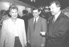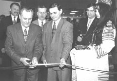 Atklājot izstādi: (no kreisās) ekonomikas ministrs Atis Sausnītis, ministru prezidenta biedrs Juris Kaksītis, Baltkrievijas kompānijas “Tehnika un komunikācijas” prezidents Georgs Bondarevs, uzņēmējdarbības un investīciju ministrs Aleksandrs Sazonovs, Baltkrievijas vēstniecības padomnieks Ivans Stepaņenko; akciju sabiedrības “Lauma” prezidente Zigrīda Rusiņa, Aleksandrs Sazonovs un Atis Sausnītis