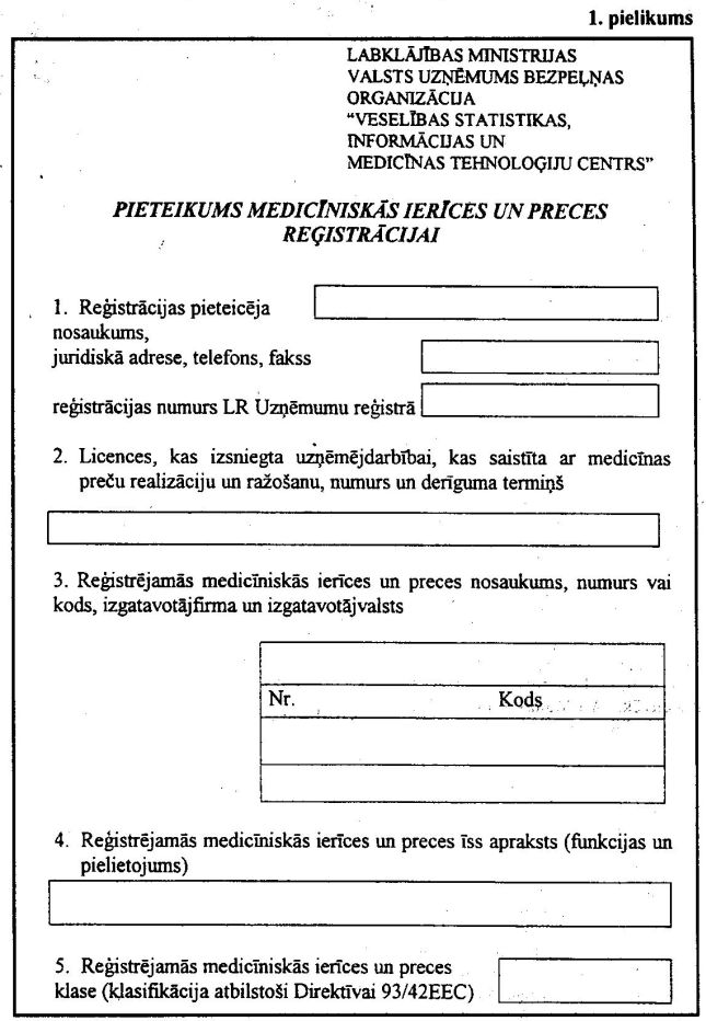 7.1. noteiktas formas rakstisku pieteikumu medicīniskās ierīces un preces tipa reģistrācijai (1. pielikums);