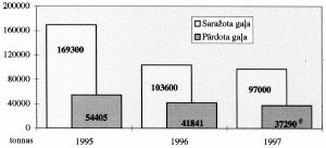 Centrālās statistikas pārvaldes dati liecina, ka 1997. gadā tika saražoti 985,3 tūkstoši tonnu piena (1996. gadā — 920,6 tūkst. t.), un tie ir 107 % salīdzinājumā ar 1996. gadu.