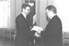 Vakar, 27.janvārī, Valsts prezidents Guntis Ulmanis un Aina Ulmanes kundze pieņēma Latvijā akreditētos ārvalstu vēstniekus: Aleksandru Udaļcovu (Krievija), Horstu Veizelu (Vācija), Hansu Magnusonu (Zviedrija), Hannu Hemeleinenu (Somija) (augšējos attēlos), Odedu Ben-Huru (Izraēla), Antonu Kozusniku (Austrija), Jaroslavu Jeslinkovu (Čehija), Alessandro Pietromarči (Itālija), Nikolasu Džaroldu (Lielbritānija), Leriju Neperu (ASV), Andri Rubinu (Latvijas Saeimas ārlietu komisijas priekšsēdētāju), Mēriju Neperi, Knutu Torasenu (Norvēģija), Maiklu Mecu Merku (Dānija) un Valdi Birkavu (Latvijas ārlietu ministru) (apakšējos attēlos) Foto: Arnis Blumbergs, “LV”