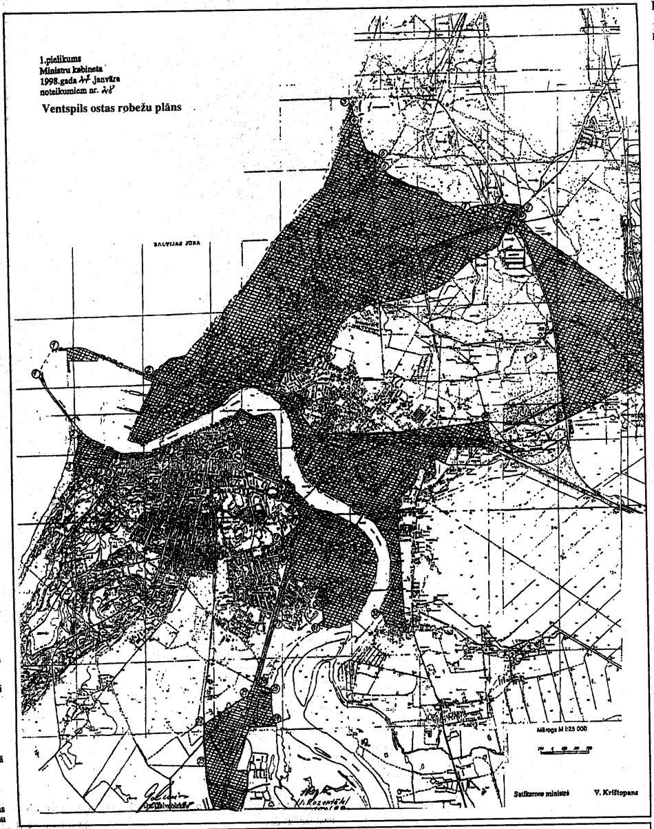 1. Noteikt Ventspils ostas robežas saskaņā ar 1., 2. un 3.pielikumu (ostas teritorijas kopplatība - 2026,45 ha, to skaitā: zeme - 1727,9 ha, ūdeņi - 298,55 ha; kopplatība tiks precizēta pēc robežu uzmērīšanas dabā).