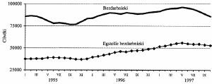 Ievērojami pieaudzis ilgstošo bezdarbnieku skaits. 1997. gada oktobra beigās vairāk nekā sešus mēnešus darbu nebija atraduši 52,9 tūkst. cilvēku, no tiem vairāk nekā gadu bez darba bija 33,2 tūkst. cilvēku (1996. gada oktobra beigās attiecīgi 47,6 tūkst. un 26,3 tūkst. cilvēku). Centrālās statistikas pārvaldes veiktā aptauja liecina, ka vidējais laiks, kad darba meklētāji bijuši bez darba, ir 23 mēneši. Trīs ceturtdaļas no visiem darba meklētājiem 1996. gada beigās meklējuši darbu ilgāk par 6 mēnešiem. Ieilgusī darba meklēšana liecina, ka zināma iedzīvotāju daļa lēni piemērojas darba tirgus prasībām, pārkvalificēšanās tempi ir zemi, darba meklētāji nav mobili.