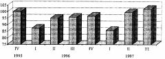 Šīs nodaļas tekstā apstrādājošā rūpniecība tiek apzīmēta kā rūpniecība (ja netiek atzīmēts īpaši). Pēc statistikas datiem, 1997. gada pirmajā ceturksnī rūpniecības ražošanas apjomi bija nedaudz mazāki nekā 1996. gada pirmajā ceturksnī, bet, jau sākot ar otro ceturksni, tā pieaugums sasniedza 6,2%, salīdzinot ar iepriekšējā gada atbilstošo ceturksni. Trešajā ceturksnī rūpnieciskās ražošanas apjomi bija jau par 7,7% lielāki nekā 1996. gada trešajā ceturksnī (skatīt 4.1. zīmējumu).