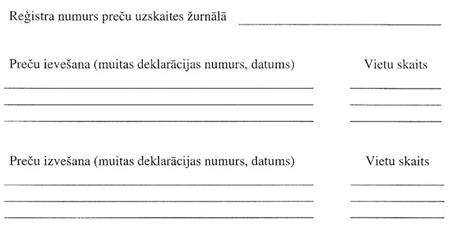 43. Muitas noliktavā preču valdītājam ir tiesības ņemt paraugus, par to samaksājot muitas maksājumus, kas saistīti ar preču izlaišanu brīvam apgrozījumam Latvijas Republikas muitas teritorijā. Šādus gadījumus noliktavas turētājs reģistrē preču uzskaites žurnālā un norāda: