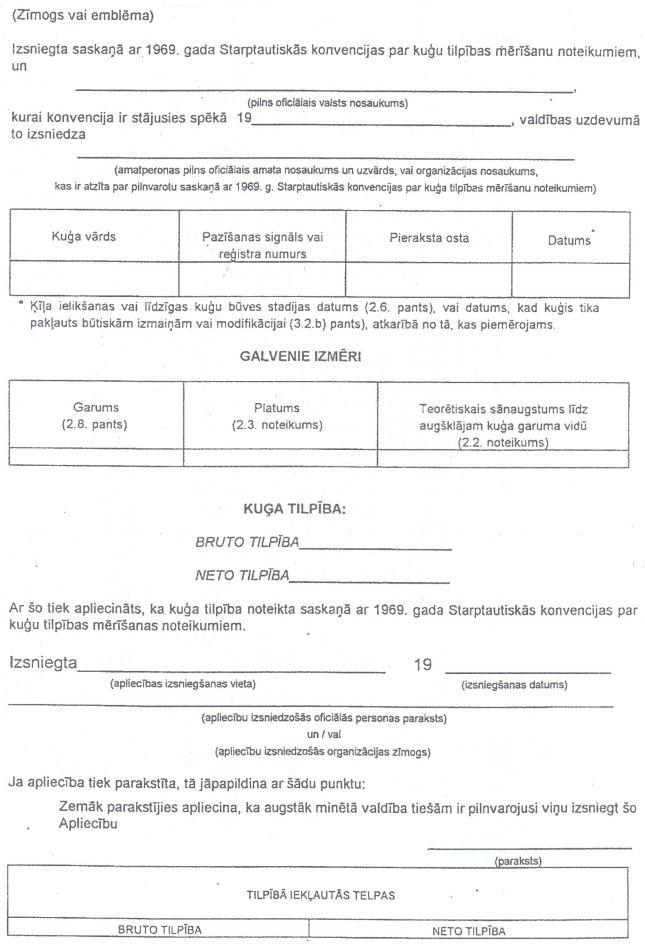 kur, V = kuģa visu slēgto telpu kopējais tilpums kubikmetros