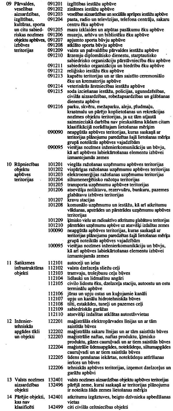 6.1. pirmo līmeni veido nekustamā īpašuma lietošanas mērķu grupas, kuras noteiktas pēc ekonomiskās darbības pazīmēm un līdzības ar spēkā esošajos teritoriju plānojumos norādīto iedalījumu apbūves vai izbūves teritorijās. Noteiktas 14 nekustamā īpašuma lietošanas mērķu grupas, kurām piešķirti kodi no 01 līdz 14;
