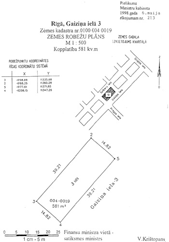 1. Saskaņā ar likuma "Par zemes reformu Latvijas Republikas pilsētās" 28.pantu atļaut Valsts nekustamā īpašuma aģentūrai pārdot ēkas pašreizējam īpašniekam — sabiedrībai ar ierobežotu atbildību "SIA "ESKADA MV"" (reģistrācijas apliecības nr.000325862, reģistrēta 1995.gada 5.jūlijā) — uzņēmējdarbībai un veikala un noliktavas uzturēšanai zemesgabalu 581 m2 platībā (zemes kadastra nr. 0100 004 0019) Rīgā, Gaiziņa ielā 3, kas ierakstīts zemesgrāmatā uz valsts vārda Finansu ministrijas personā. Zemesgabalu pārdot par tirgus cenu, bet tā nedrīkst būt zemāka par zemesgabala kadastrālo vērtību. Zemesgabala robežas norādītas pielikumā.