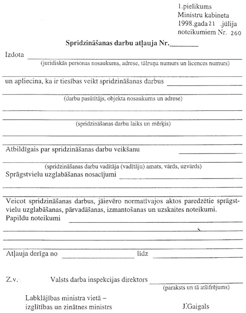 7. Valsts darba inspekcija 10 dienu laikā no pieteikuma saņemšanas dienas izskata iesniegtos dokumentus un pieņem lēmumu par spridzināšanas darbu atļaujas vai atļaujas sprāgstvielu noliktavas ierīkošanai izsniegšanu vai motivētu atteikumu. Ja iesniegtajos dokumentos nav pietiekamu ziņu jautājuma objektīvai izlemšanai, Valsts darba inspekcija par to informē pieteikuma iesniedzēju. Pēc papildu informācijas saņemšanas jautājums 10 dienu laikā izskatāms atkārtoti.