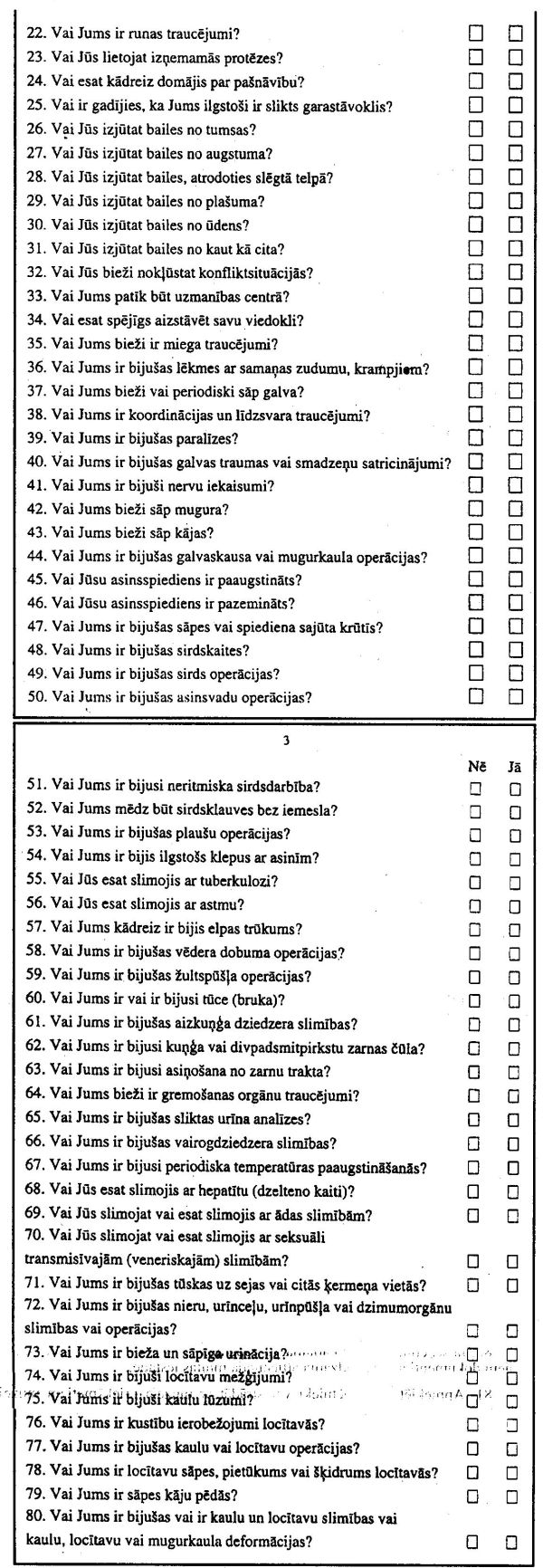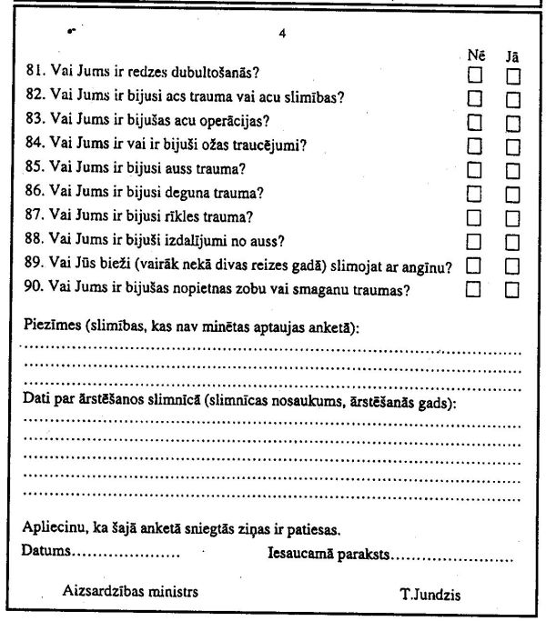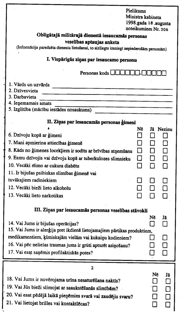 5. Valsts militārā dienesta pārvaldē (nodaļā) obligātajam militārajam dienestam pakļautā persona aizpilda veselības aptaujas anketu (pielikums), kurā sniegto informāciju izmanto ārsti eksperti, pārbaudot attiecīgās personas veselību.
