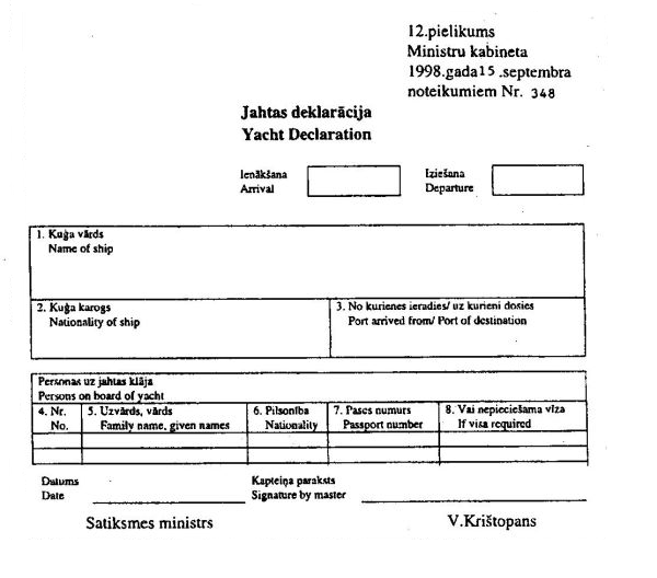 25. Jahtas kapteinis kārto ostas formalitātes, ja jahta ienāk ostā pēc Latvijas Republikas valsts robežas šķērsošanas vai iziet no tās, lai šķērsotu Latvijas Republikas valsts robežu. Jahtas kapteinis iesniedz jahtklubam (ja tāda nav, — ostas kontroles dienestam) jahtas deklarāciju (12.pielikums) divos eksemplāros.