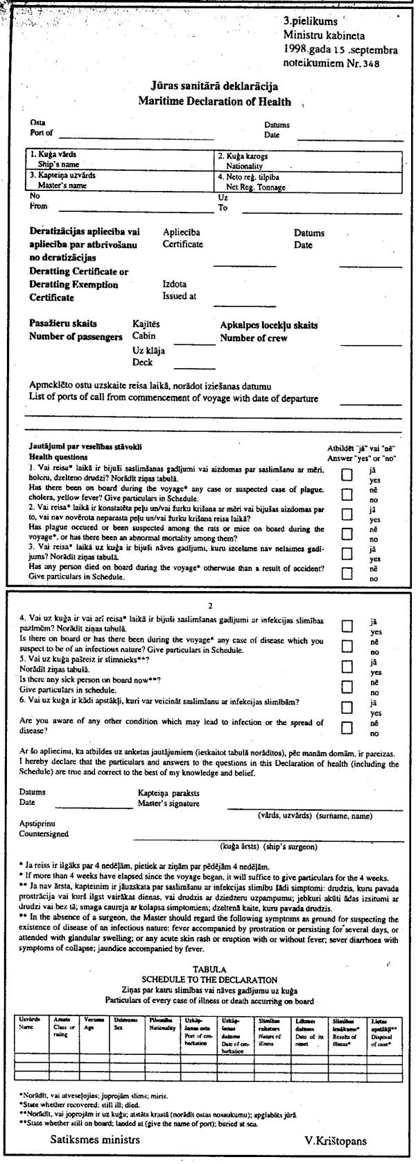 1.5. jūras sanitārā deklarācija — dokuments, kas sniedz informāciju par to personu veselības stāvokli, kuras atrodas uz kuģa reisa laikā un kuģim ienākot ostā (3.pielikums);
