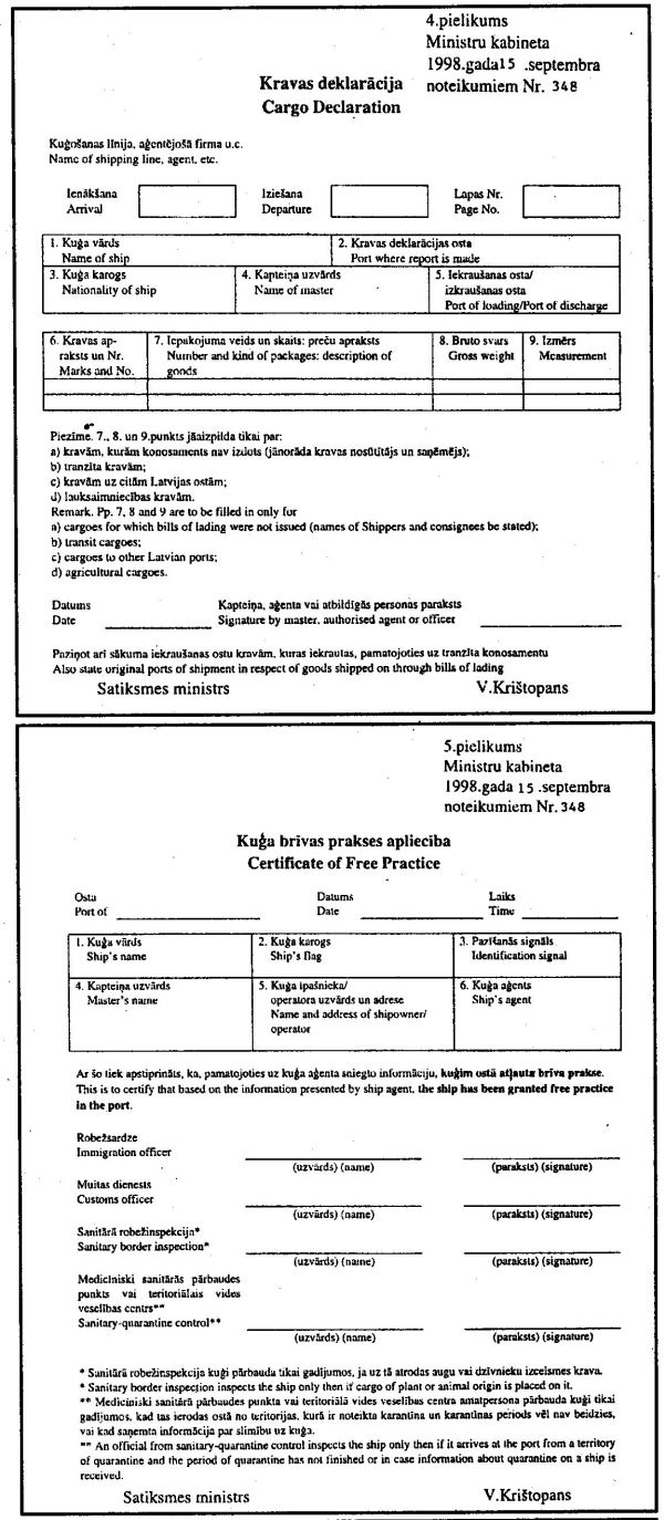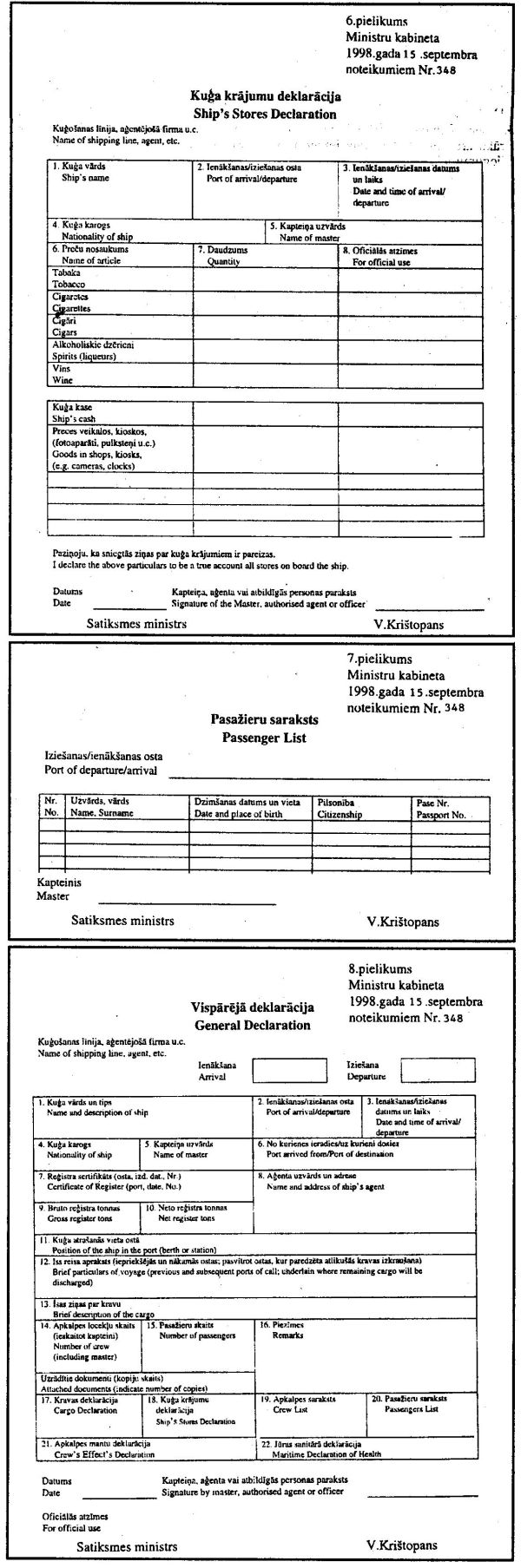 Ar šo tie apstiprināts, ka kuģis nokārtojis visas ostas formalitātes kuģa ienākšanai ostā 19_____. g. ________________ ___________________ stāvēšanai un iziešanai no ostas 19____. g. ___________ _____________________ un tam atļauts iziet jūrā.