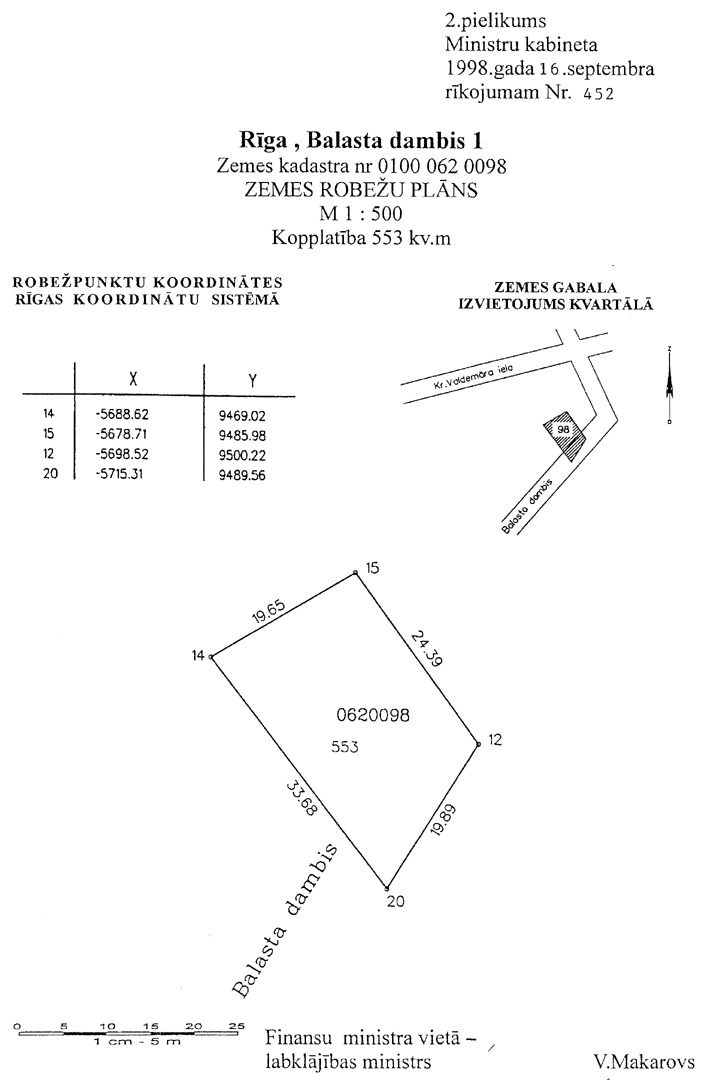 2. Rīgā, Balasta dambī 1, - zeme 553 m2 platībā (zemes kadastra Nr. 0100 062 0098), zemesgabala robežas norādītas 2.pielikumā.