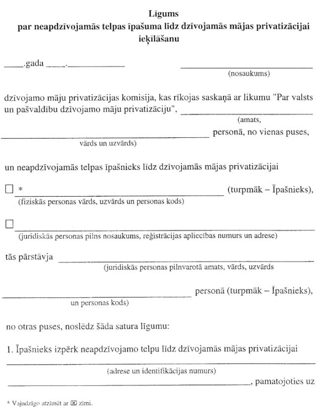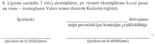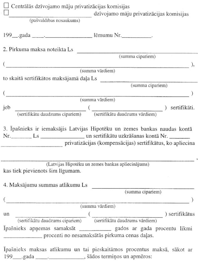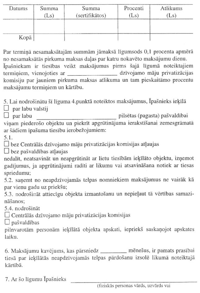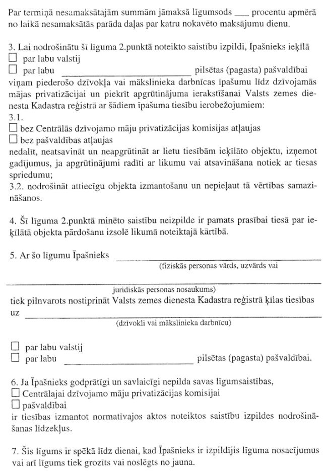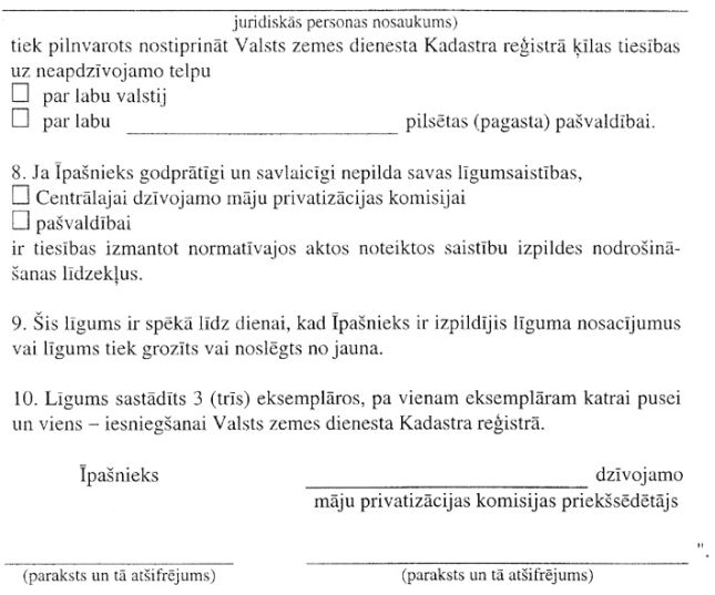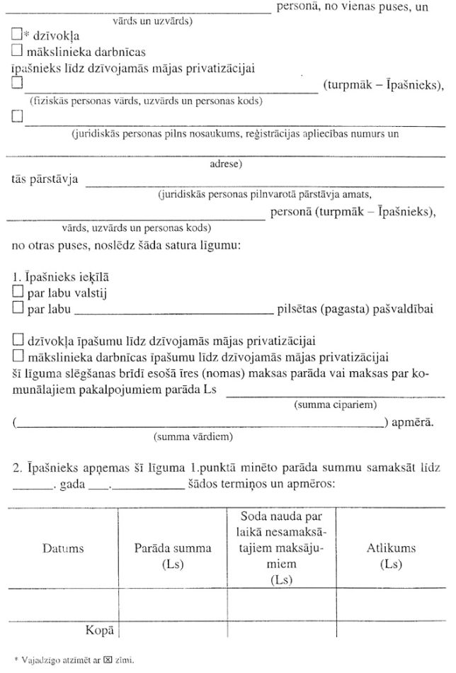 "9.1 Ja dzīvoklis vai mākslinieka darbnīca tiek nodota īpašumā personai (personām), kurai (kurām) privatizācijas brīdī ir īres (nomas) vai komunālo pakalpojumu maksājumu parāds, privatizācijas komisija slēdz līgumu ar pircēju par dzīvokļa vai mākslinieka darbnīcas ieķīlāšanu par labu valstij vai attiecīgajai pašvaldībai (2.pielikums) un nosaka ierobežojumus rīcībai ar dzīvokļa vai mākslinieka darbnīcas īpašumu līdz dzīvojamās mājas privatizācijai. Minēto līgumu slēdz pēc tam, kad privatizācijas komisija ir saņēmusi no Latvijas Hipotēku un zemes bankas apstiprinājumu par pirkuma maksas un maksas par dzīvojamās mājas sagatavošanu privatizācijai veikšanu."