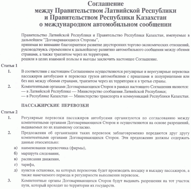 1. Šajā Nolīgumā paredzētos pārvadājumus var veikt tikai tie pārvadātāji, kuri saskaņā ar savas valsts likumiem un citiem tiesību un normatīvajiem aktiem ir tiesīgi veikt starptautiskos pārvadā jumus.