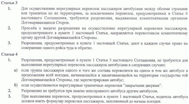 1. Pasažieru neregulāru pārvadājumu veikšanai ar autobusiem starp abām valstīm vai tranzītā caur to teritorijām, izņemot šā Nolīguma 4. pantā minētos pārvadājumus, nepieciešamas Līgumslēdzēju Pušu kompetento institūciju izdotas atļaujas.