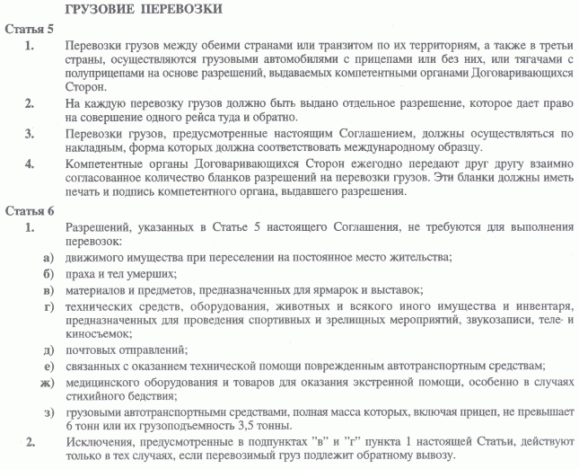 1. Kravu pārvadājumi starp abām valstīm vai tranzītā caur to teritorijām, kā arī uz trešajām valstīm ar kravas automobiļiem ar vai bez piekabēm vai arī ar autovilcējiem ar puspiekabēm veicami, pamatojoties uz Līgumslēdzēju Pušu kompetento institūciju izdotām pārvadājumu atļaujām.