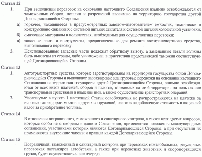 1. Autotransporta līdzekļi, kas reģistrēti vienas Līgumslēdzējas Puses valsts teritorijā un ar ko saskaņā ar šo Nolīgumu veic pasažieru vai kravas pārvadājumus otras Līgumslēdzējas Puses valsts teritorijā, tiek savstarpēji atbrīvoti no visu veidu maksājumiem, nodevām un nodokļiem, kas šajā teritorijā tiek iekasēti par transporta līdzekļu valdījumu un lietošanu, kā arī par transporta operāciju veikšanu.
